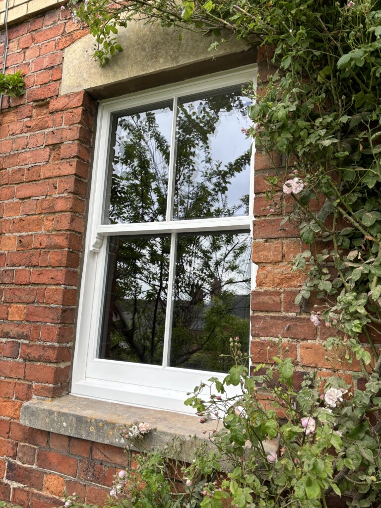 When we provide and fit a new sash box window, which can be single glazed (4mm) or double glazed (24mm) argon filled sealed unit (U Value 1.2). All glazed units have toughened glass to lower sash windows to comply with building regulations.